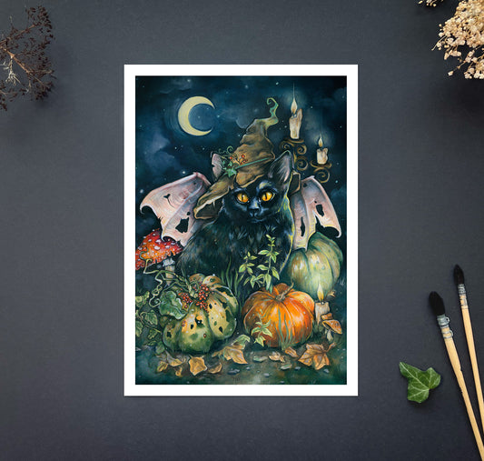 Fantasy Wandbild Halloween-Katze, Hexenkatze, Fledermaus