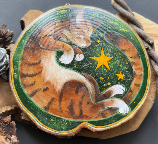 AusverkauftKatze träumend, handbemalte Holzscheibe