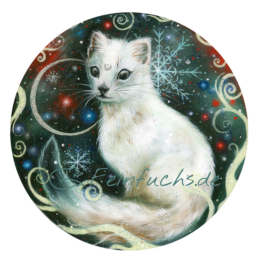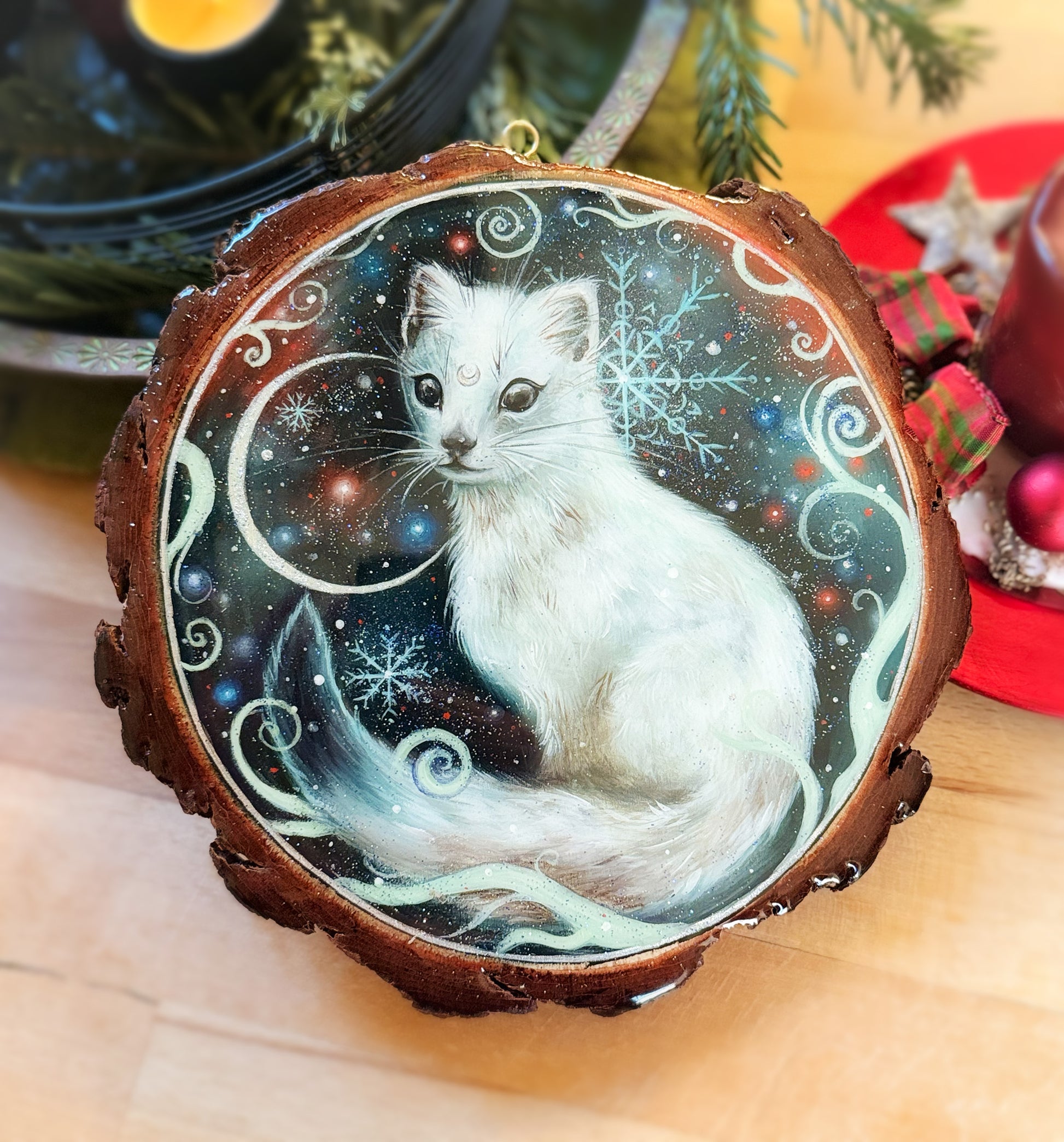 Handbemalte Holzscheibe – Winterliche Mystik mit Fantasy-Wiesel
