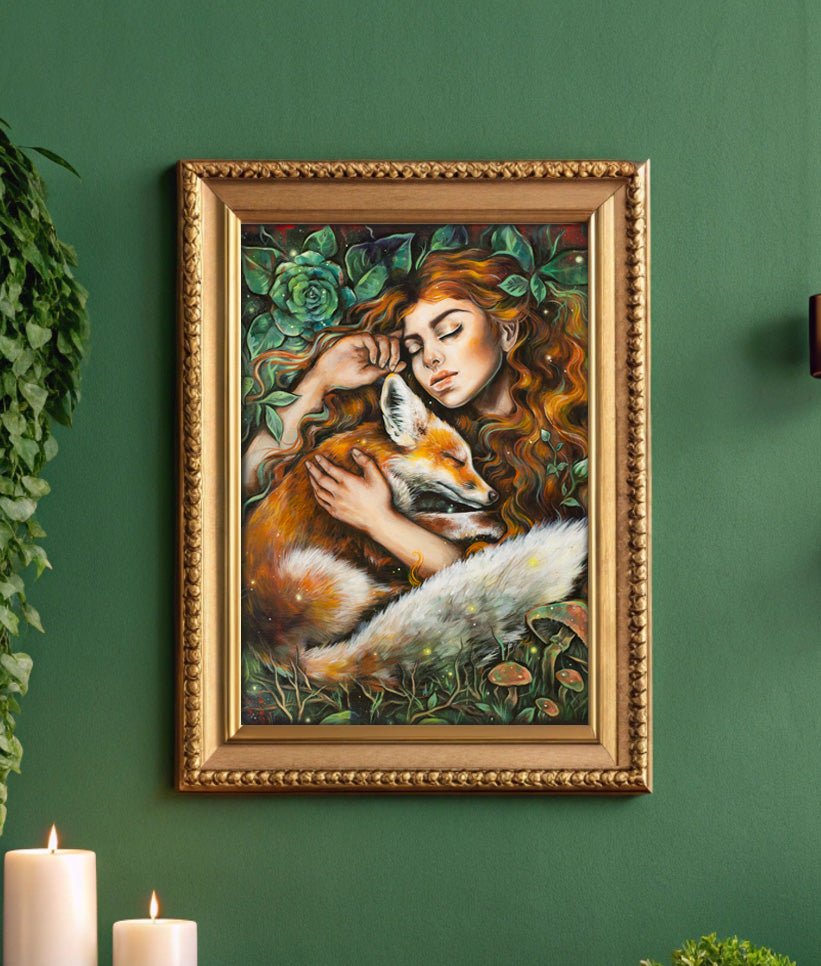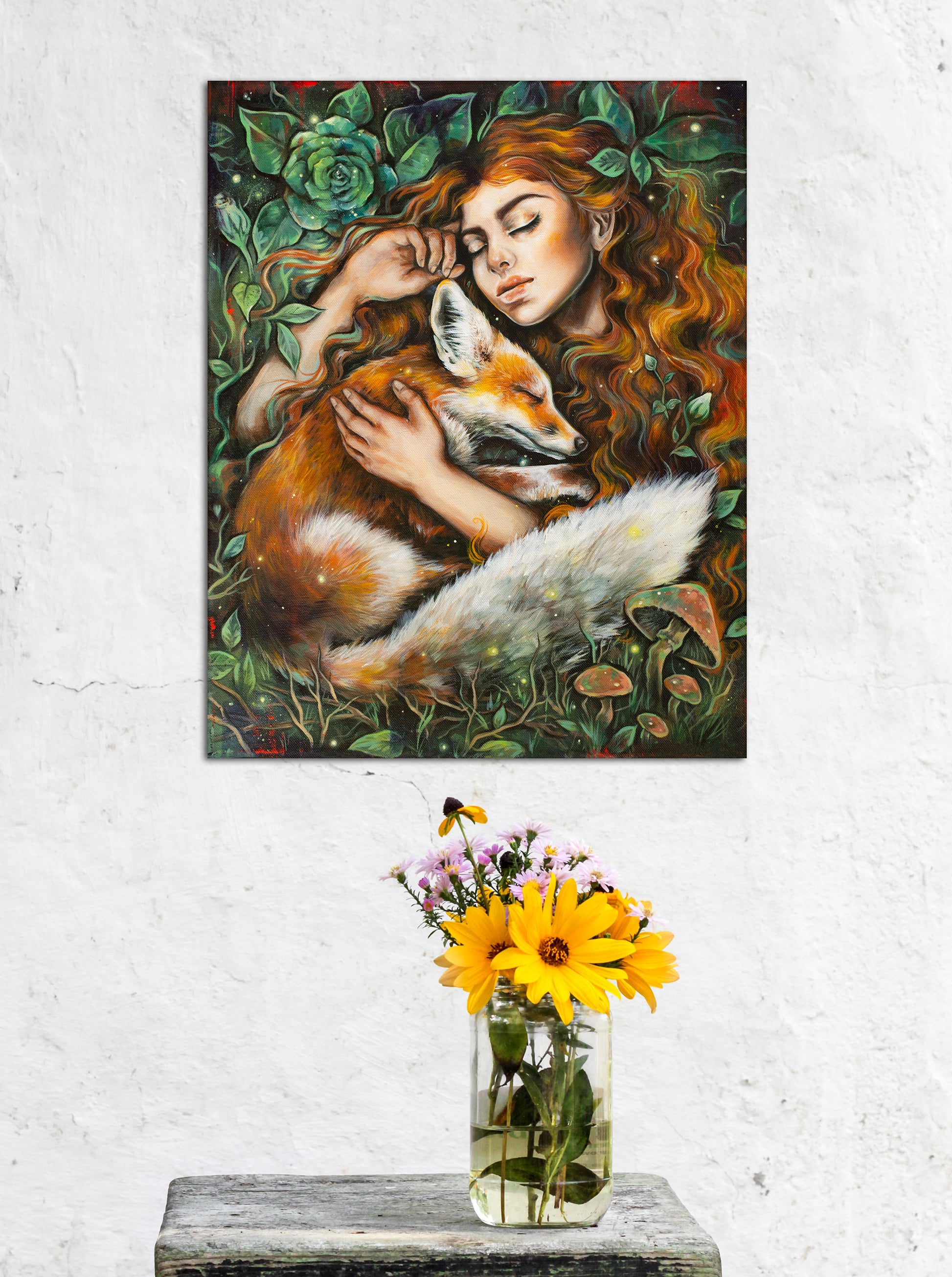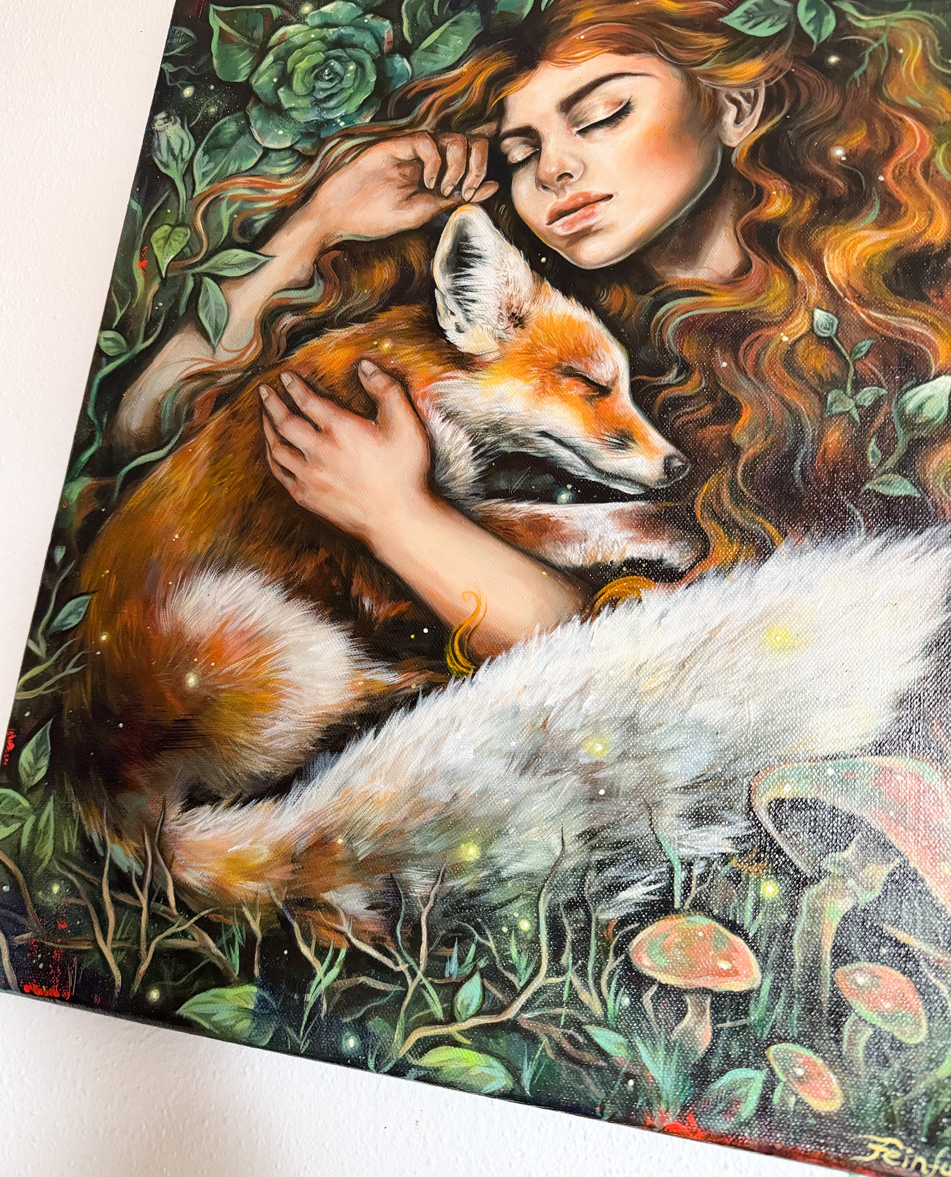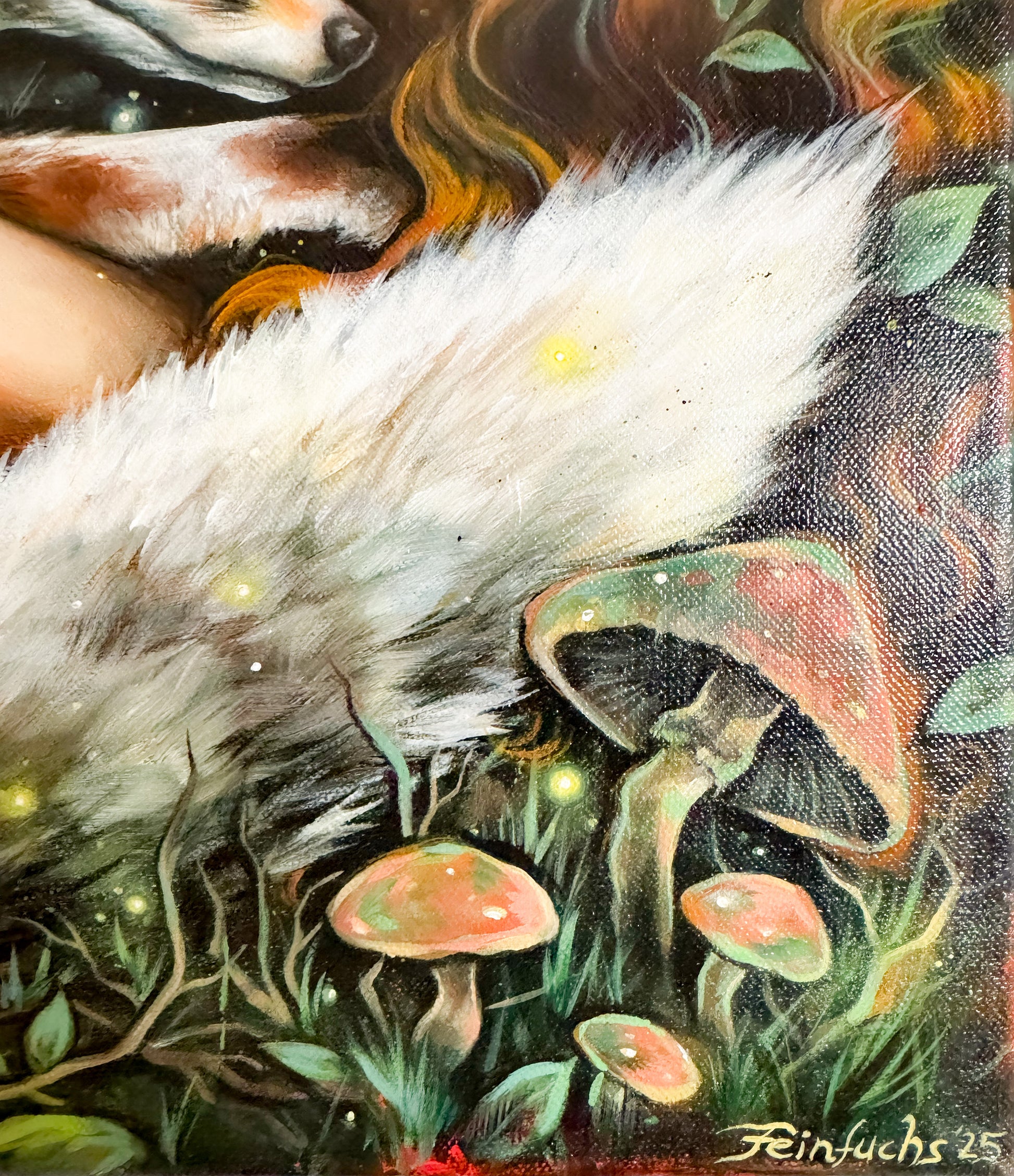 Originalmalerei "Fia", erstellt in Acrylfarben auf Leinwand. "Fia" oder im Keltischen "dunkler Friede“ leitet sich vom altnordischen Wort für Wildheit und Leben ab. Die junge Frau ruht im Einklang mit dem Fuchs – ein Symbol für Intuition und Wandel. Verwoben mit Blättern und in stiller Verbundenheit, erzählt das Bild eine zeitlose Geschichte von Vertrauen und der stillen Magie der Wildnis. Das Bild wurde mit einer glänzenden und schützenden Schlussfirnis versehen.